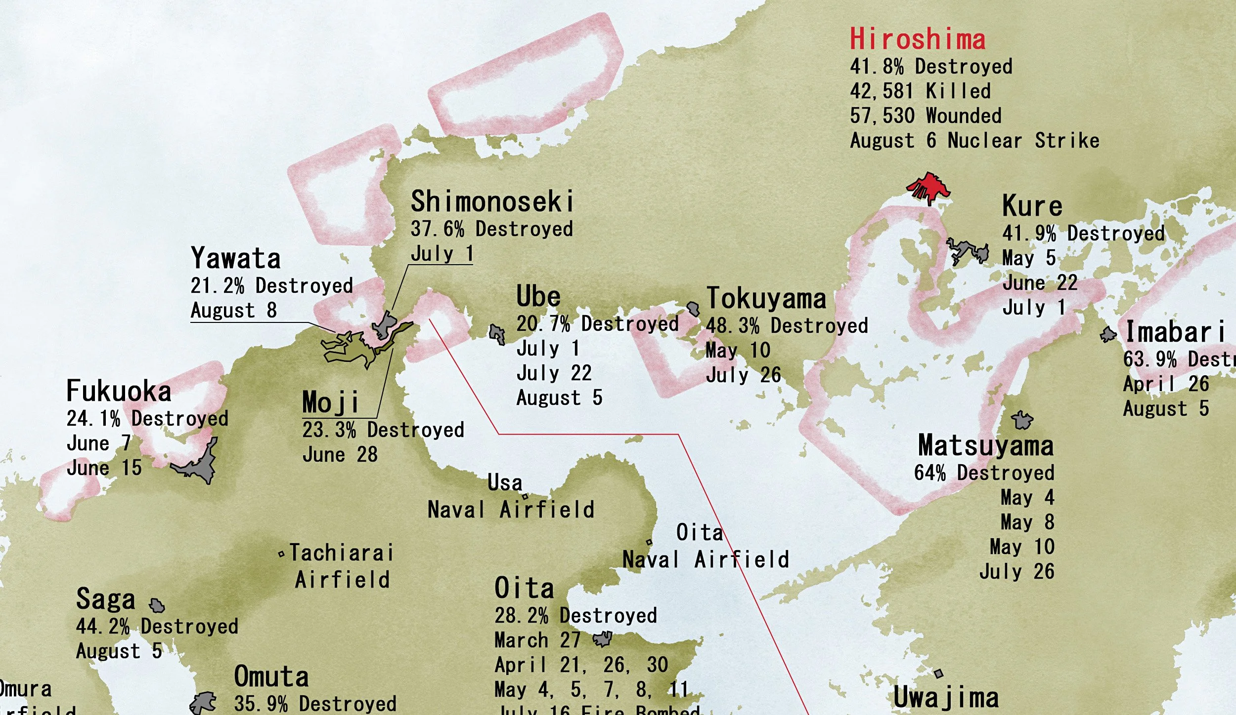 This campaign brought the Second World War to an end, in the process inflicting staggering losses on the Japanese civilian population. The graphic illustrates the lethality of modern weapon systems, which is a lesson in the vital necessity for nations to solve their problems through peaceful means.