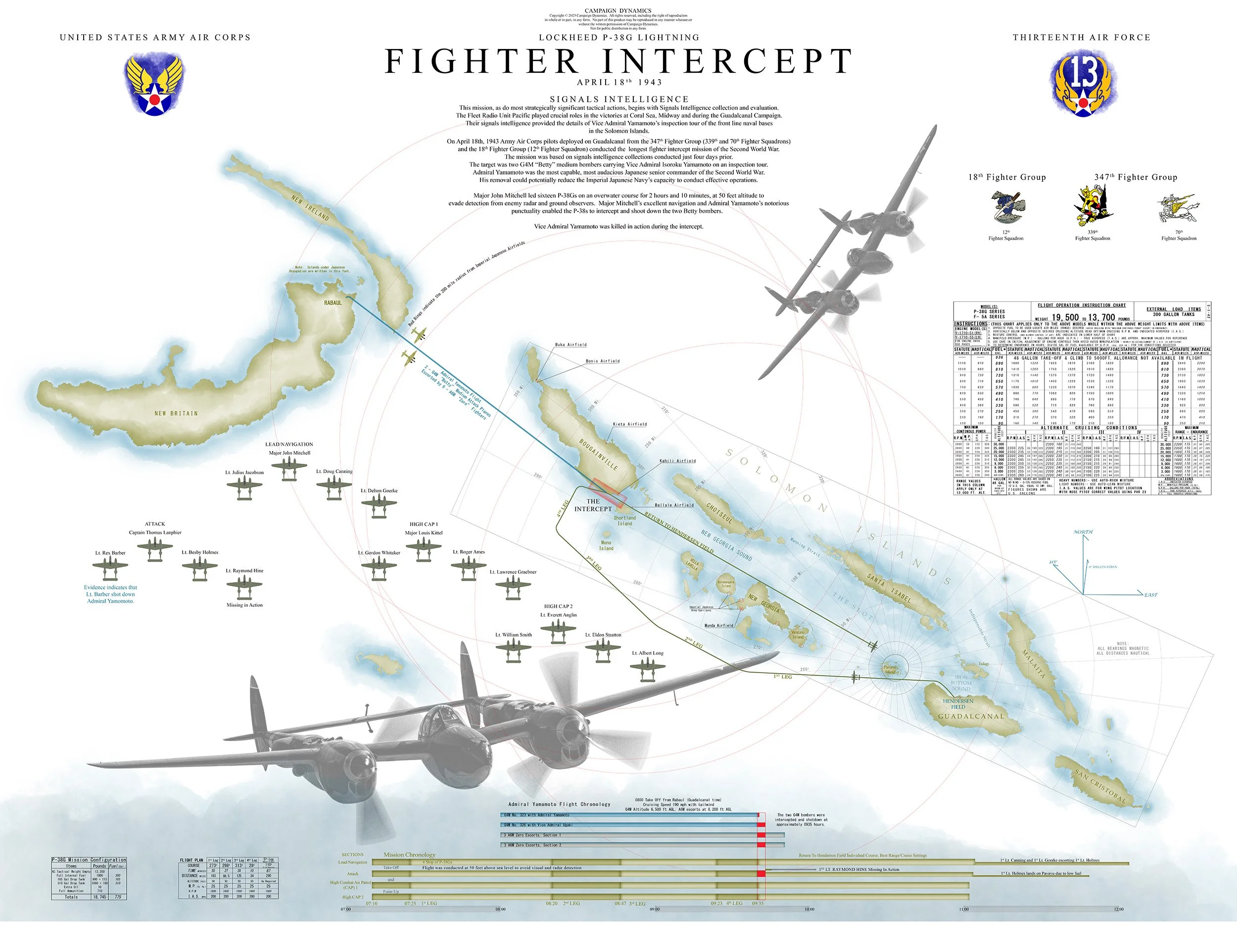 Fighter Intercept details the intercept of Admiral Yamamoto by P-38 fighter aircraft during the Solomons Campaign. The data illustrates the weaponization of signals intelligence collection into strategic decision making, and the delegation of those decisions to theater operations and tactical units.