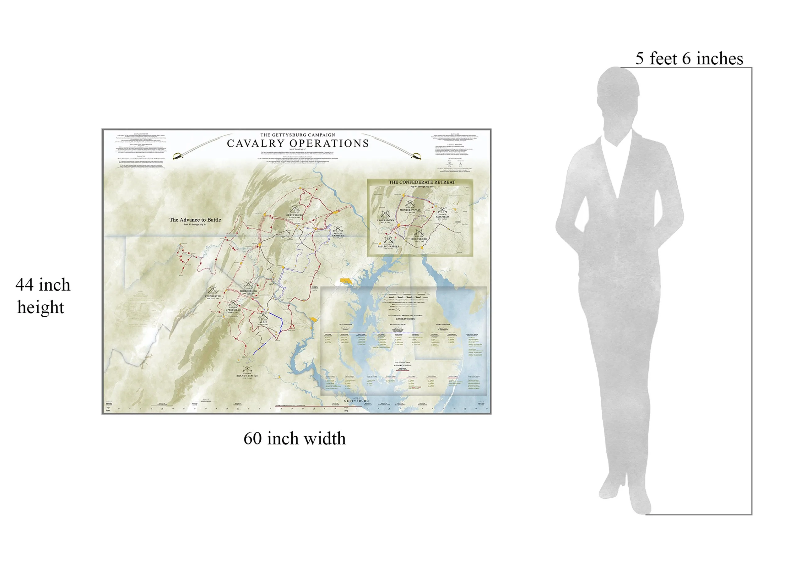 The timeline is 72 inches wide by 44 inches tall. The map is 60 inches wide by 44 inches tall.