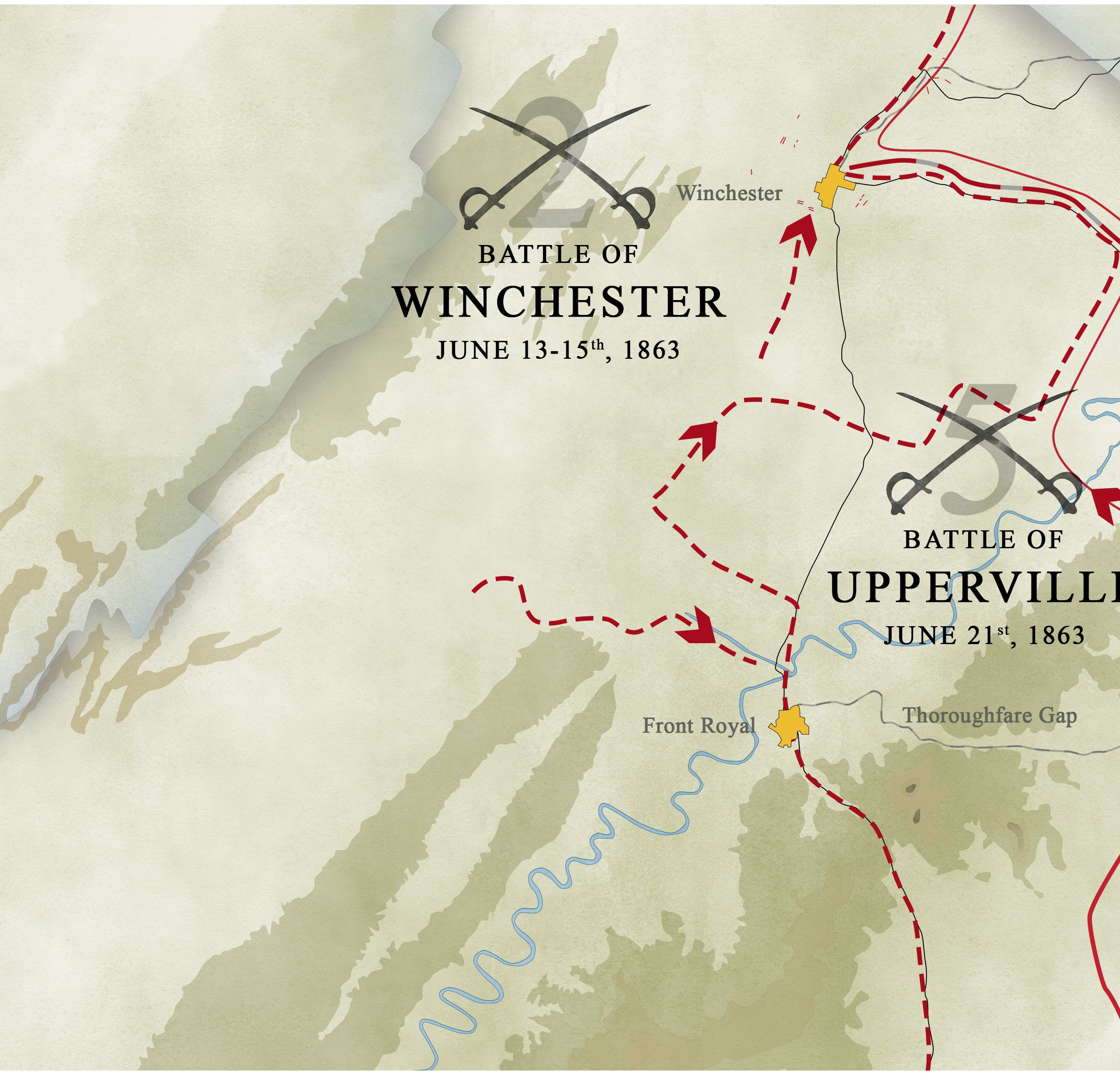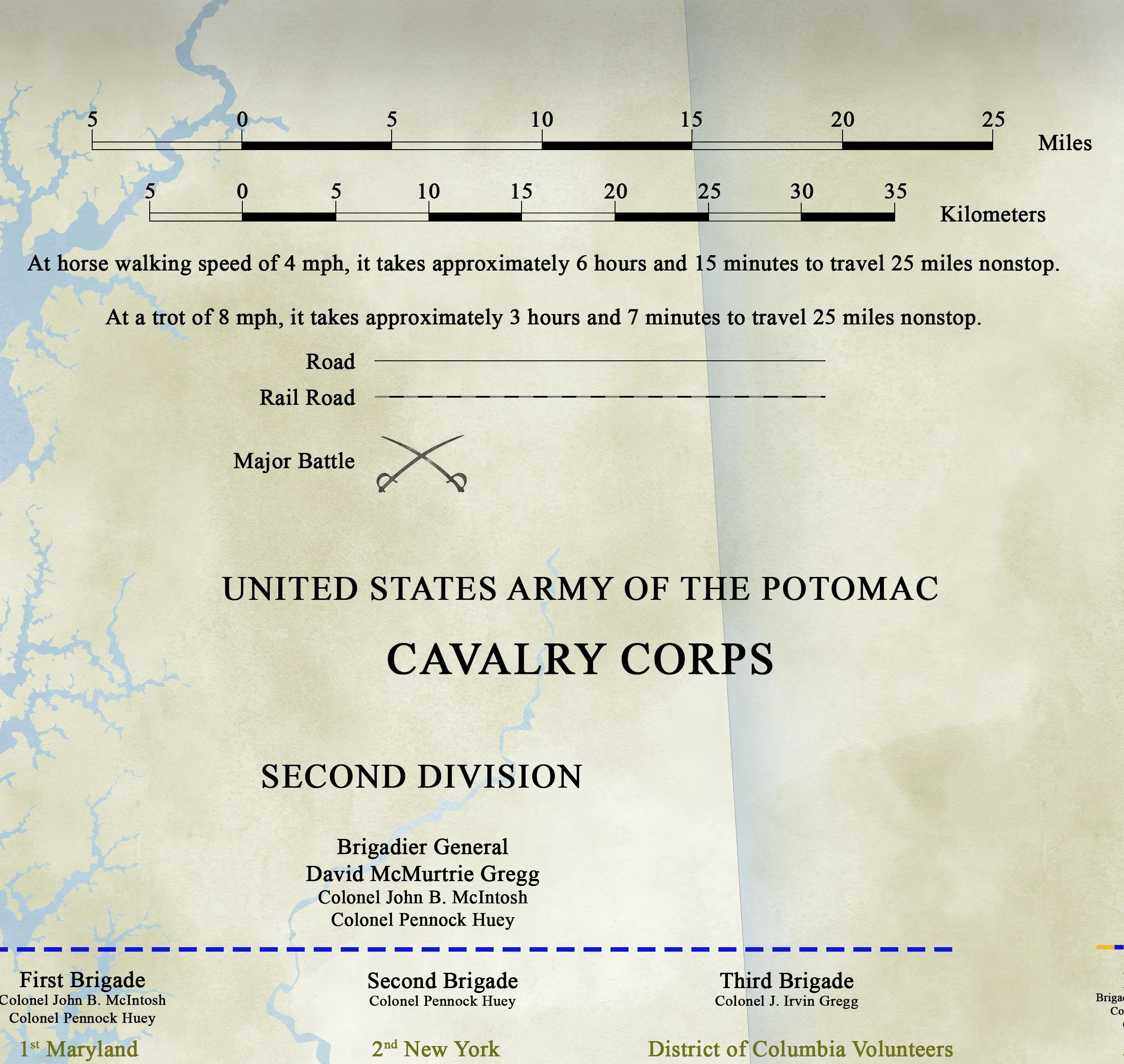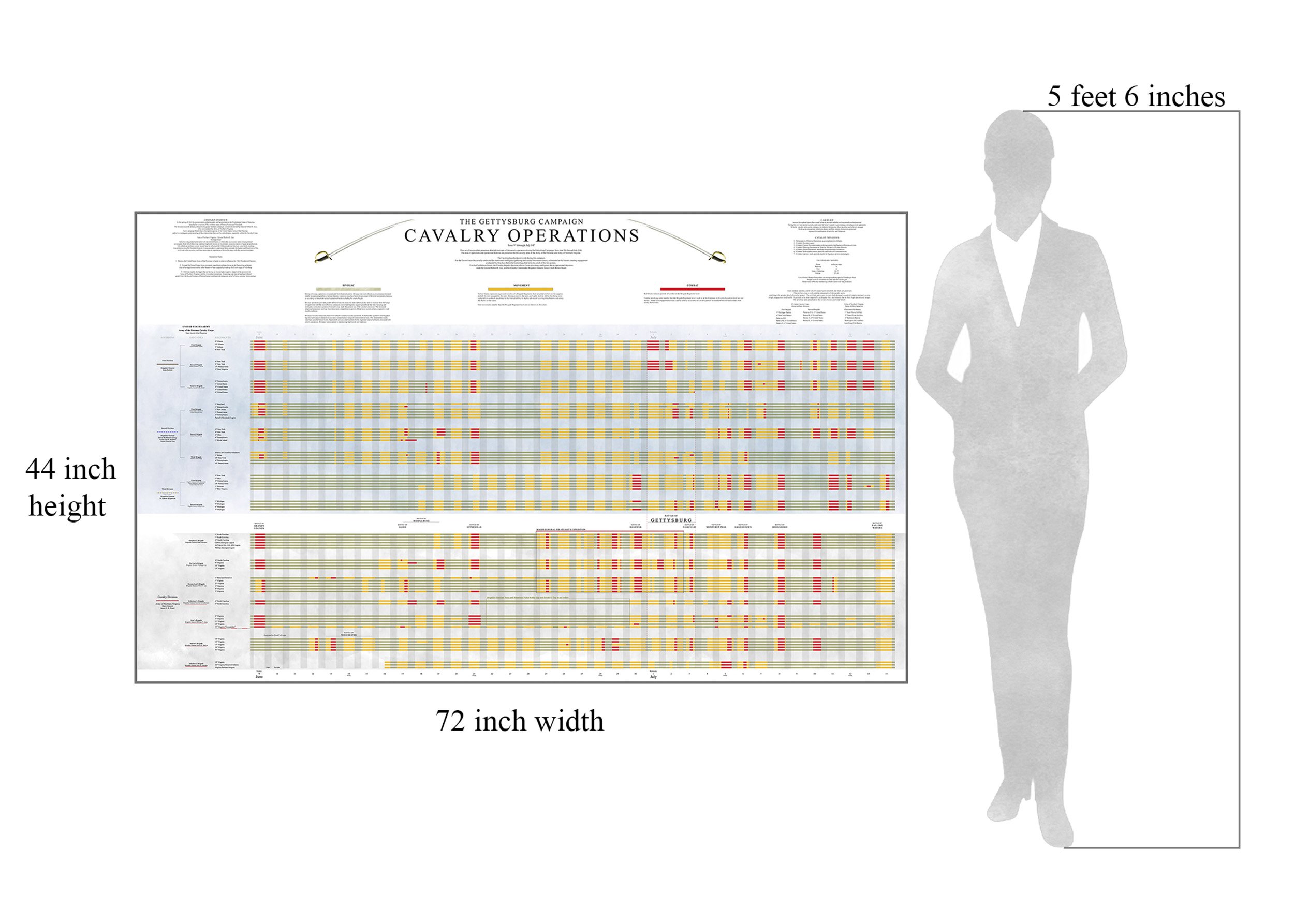 This is a set of 2 graphics, a timeline that shows the daily tempo of the individual cavalry regiments, and a map to illustrate that roaming. We divided the regimental activities into three categories to assist in this project. The categories are bivouac, movement and combat. This categorization enabled us to more clearly define the campaign. What emerges is the exhaustive operational tempo the regiments sustained.