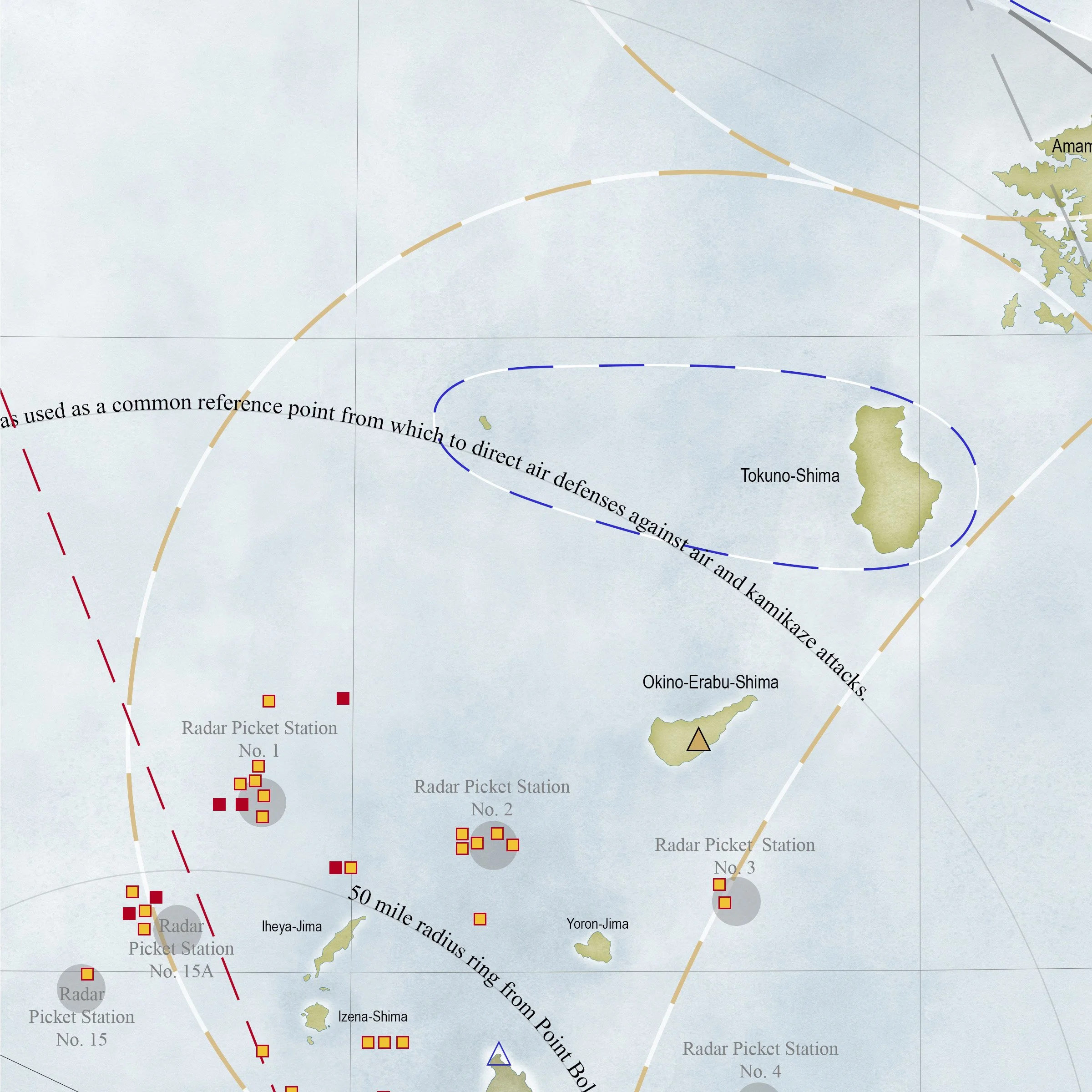 3. Naval Campaign Overview, provides a map of the vast geographic area where the naval-air battle was fought. The locations of damaged ship and sinkings are provided to illustrate immense threat posed by the kamikaze attacks. Radar picket ship stations are also provided. An example of an aircraft carrier flight schedule is included to provide an insight into the cyclical nature of daily carrier flight operations, and why it was imperative to establish land based airfields.